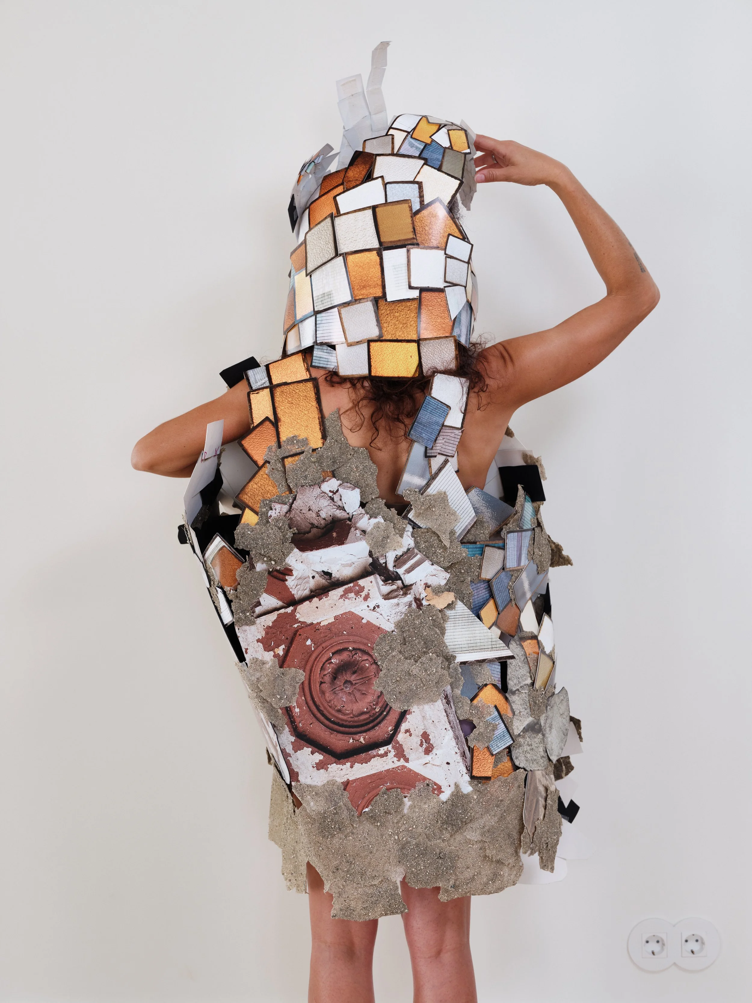 Material - Single channel video. Wearable sculpture made from photographs, cardboard, decomposed granite and glue.