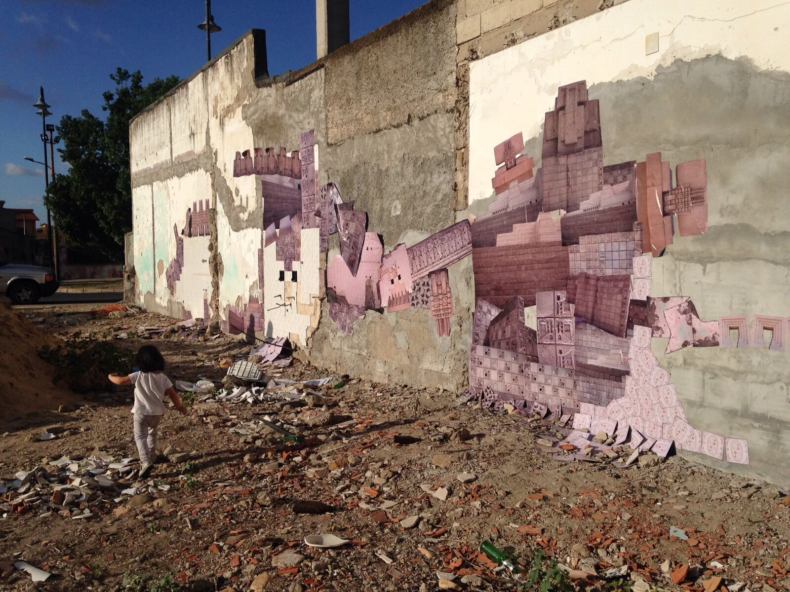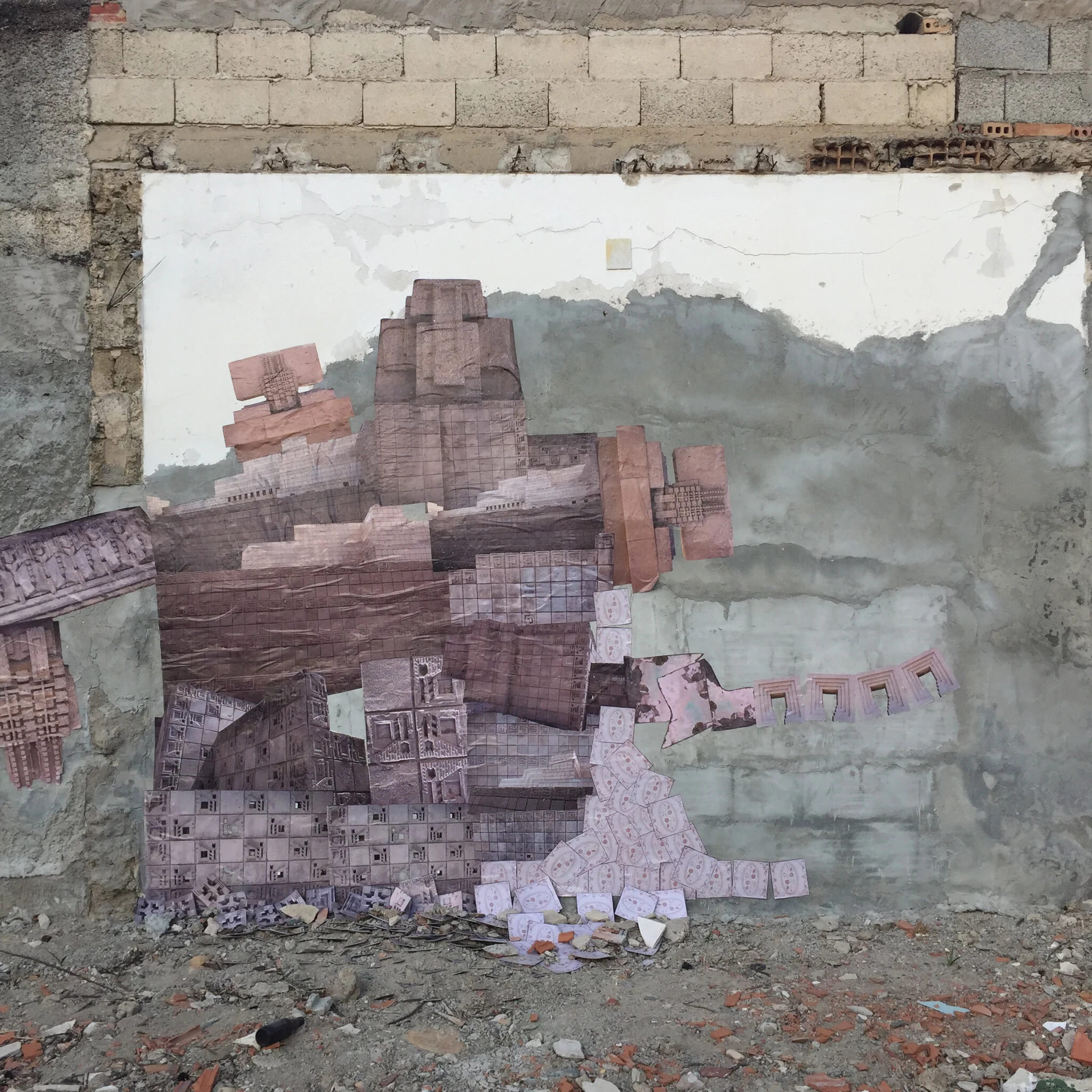 Repubblica & Glendower is a temporary installation that sits on an abandoned lot on Via Repubblica near the center of the small town of Villasor. The only remnants of the building that once existed there, were parts of a tiled bathroom still stuck to a wall. The piece is an exploration into decaying architecture... I wanted to embrace what was left there... but also infuse something new into the space. In the piece two distinctly different types of architecture are combined to explore the idea of what is "sacred architecture" and worthy of preservation and what is deemed suitable for abandonment. For the piece, photographs were taken at the site and also of prominent architectural elements of the Frank Lloyd Wright homes in Los Angeles. The images were then reinstalled at the site using street art techniques for its temporality. In a space where kids go to smoke... stray dogs gather and trash seems to collect readily... the piece will slowly start to change, destruct and decay over time.